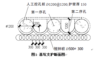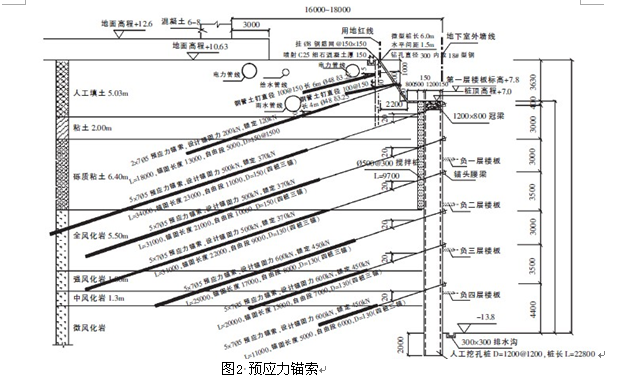 樁為圓樁與方樁(有效邊長為1.2m)兩種,分一序圓樁、二序方樁施工,直徑D1200mm,樁中心距1200mm,護壁厚150mm,緊密連接形成一個連接的墻體,作為地下室外墻使用,樁頂冠梁800mm×1200mm,樁身與冠梁混凝土等級均采用C30,錨索位置設(shè)置鋼筋混凝土腰梁,錨索張拉鎖定在腰梁上。