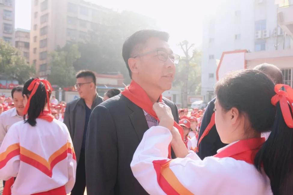 在宣布主題隊(duì)日活動開始時,學(xué)生們?yōu)榧钨e獻(xiàn)上紅領(lǐng)巾,并出隊(duì)旗、唱隊(duì)歌。