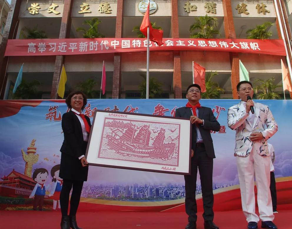 學(xué)校為了表達(dá)對林董事長誠摯的謝意,向我司贈送剪紙作品《一帆風(fēng)順》,這一幅剪紙是由汕頭市非遺傳承人陳小燕老師親自設(shè)計創(chuàng)作的,馮校長代表學(xué)校贈送作品,表達(dá)對南華公司的美好祝愿。