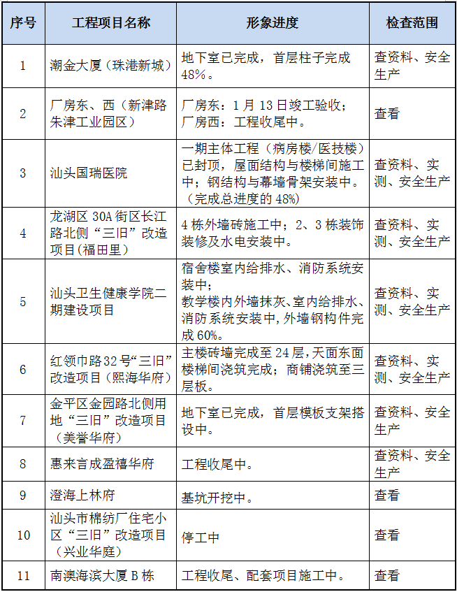 按照集團(tuán)公司定期檢查部署,公司于3月24日至26日組織了2021年第一季度質(zhì)安大檢查、公司定期檢查及復(fù)工復(fù)產(chǎn)大檢查,檢查共三天。本次檢查,各工地的項(xiàng)目負(fù)責(zé)人能重視,有關(guān)人員能在工地配合檢查,現(xiàn)將檢查情況總結(jié)如下: