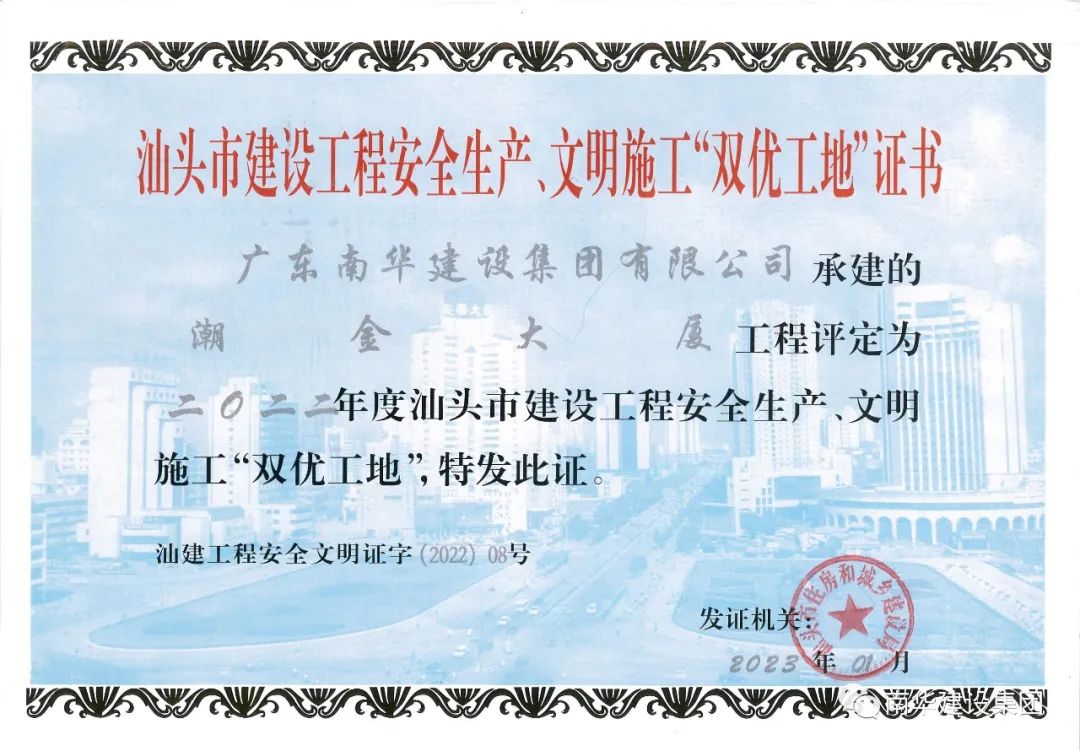 新年元月,由集團(tuán)公司投資及承建的潮金大廈項目,喜獲汕頭市住建局頒發(fā)的2022年度汕頭市建設(shè)工程安全生產(chǎn)、文明施工“雙優(yōu)工地”。集團(tuán)公司一直秉承“科學(xué)管理、創(chuàng)時代精品;誠信服務(wù)、讓客戶滿意” 的質(zhì)量方針、“以質(zhì)取勝、信守合同”的企業(yè)精神以及堅持“安全第一、預(yù)防為主、綜合治理”安全生產(chǎn)工作方針,堅持貫徹項目管理創(chuàng)優(yōu)意識,各項目部對質(zhì)量、安全意識得到了進(jìn)一步提升,推動企業(yè)高質(zhì)量發(fā)展。
