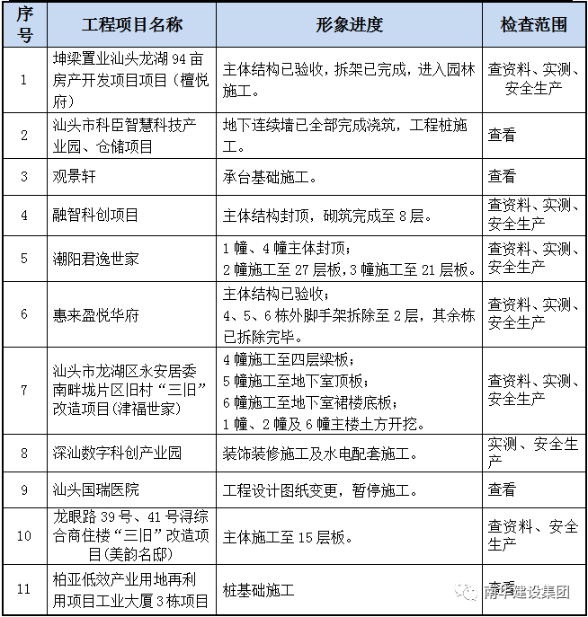 根據(jù)《汕頭市住房和城鄉(xiāng)建設(shè)局印發(fā)的關(guān)于全市城鄉(xiāng)住房建設(shè)領(lǐng)域重點行業(yè)安全生產(chǎn)大檢查的通知》、《關(guān)于做好國務(wù)院安委會2023年省級政府安全生產(chǎn)和消防工作考核巡查開展專項排查整治行動自查自改工作的通知》的要求、重大安全事故隱患專項排查整治,集團公司本季度重點對在建項目建筑起重機械、高支模、深基坑、高處墜落、預(yù)防坍塌和施工消防安全等工程分別進行了專項檢查,重點檢查以下專項工程的落實情況: